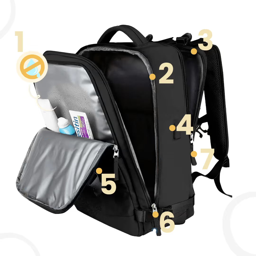 ¿Ropa mojada? ¿Zapatos aparte? ¡Resuelto! Esta mochila cuenta con un compartimento independiente para zapatos y otro impermeable para guardar artículos húmedos como toallas o ropa de gimnasio. Ya sea en el hotel, en una caminata o yendo al gimnasio, todo tendrá su lugar y sin mezclar olores ni humedad.