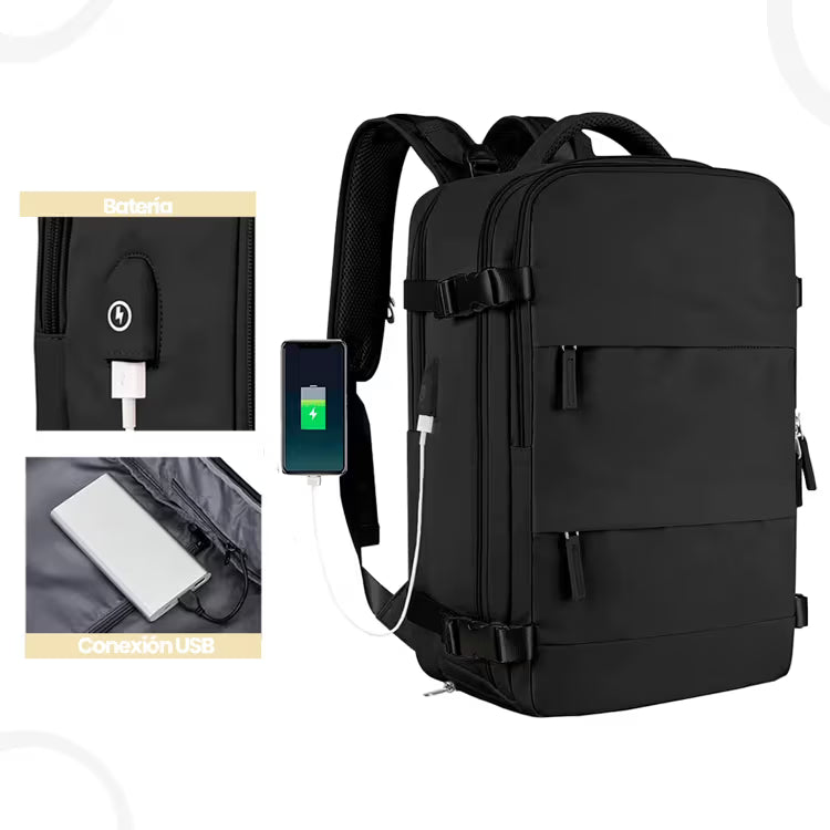 Gracias a su puerto USB externo, podrás conectar una batería portátil desde el interior y cargar tu celular o tablet sin abrir la mochila. Mantente conectado mientras caminas, sin tener que cargar el dispositivo en la mano.
